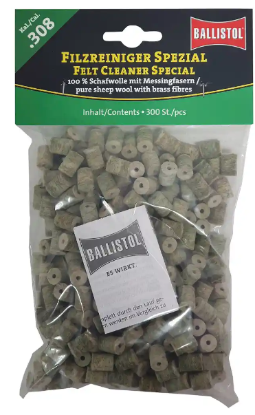 Die Spezial Reinigungsfilze von Ballistol bestehen aus reiner Schafwolle mit eingewebten Mesingfasern und sind besonders für die Intensiv-Reinigung stark verschmutzter Läufe geeignet.