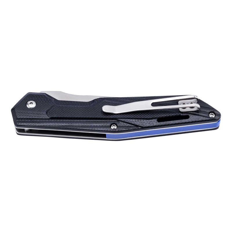 Dieses Herbertz Taschenmesser weiß durch seine modifizierte Tanto Klinge aus rostfreiem AISI 420 Stahl zu überzeugen. Die satinierte Klinge kann über einen Nagelhau einfach geöffnet werden und wird in dieser Position von einem Liner Lock Mechanismus zuverlässig arretiert. Das Griffdesign spiegelt die Klingenform wider und liegt Dank der gefrästen Griffschalen aus schwarzem G10 sicher in der Hand. Ein Trennelement am Griffrücken aus blauem G10 sorgt für ein optisches Highlight.