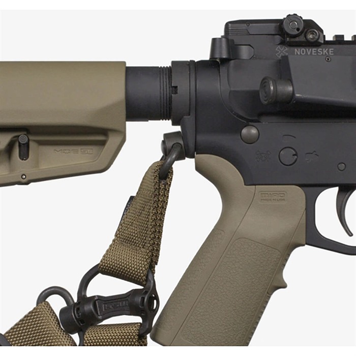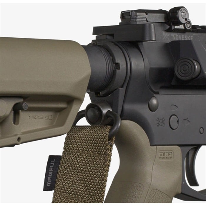 Um die Montage durchzuführen, entferne einfach die Standard-AR-15/M4-Karabiner-Endplatte und schiebe die ASAP-QD auf. Sie ist kompatibel mit Einpunkt-Schlingen, die über push-button QD connectors verfügen, wie z.B. Magpul's MS4® Dual QD GEN 2 Sling, sowie der MS1® Multi-Mission Sling mit einer QD-Schlaufe auf der Rückseite. Schlingen sind separat erhältlich.