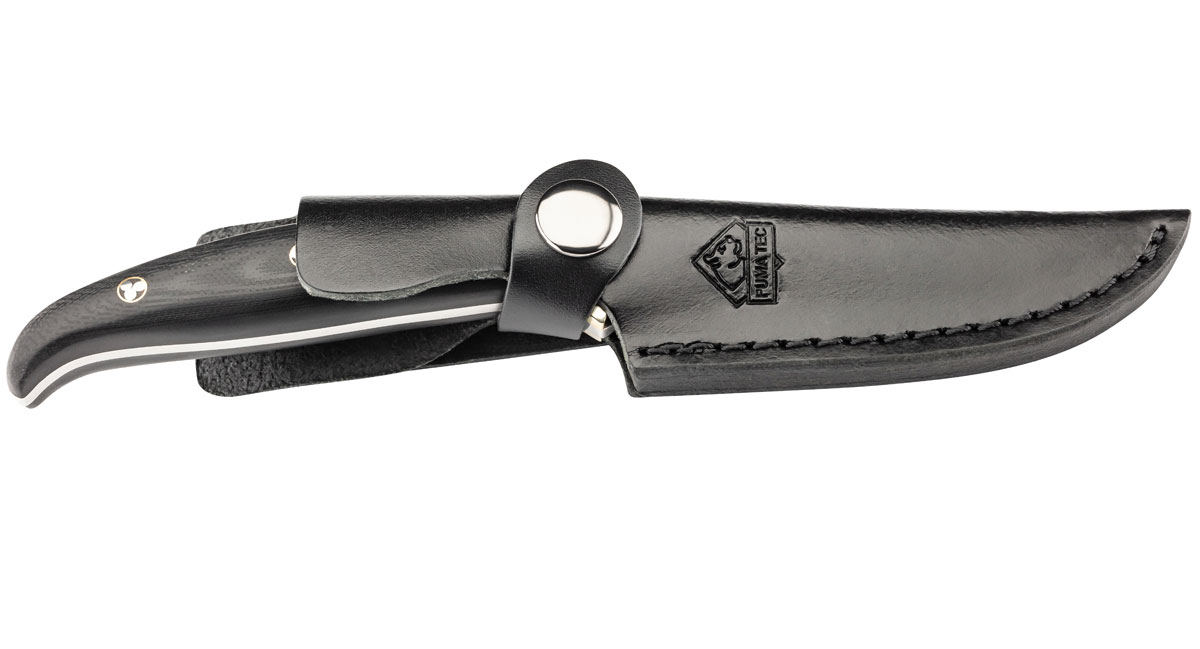 Ein handliches und schönes Gürtelmesser präsentiert PUMA TEC mit diesem Modell. Die feststehende Full Tang Klinge wird aus rostfreiem AISI 420 Stahl gefertigt. Die Griffschalen aus schwarzem G10 bilden in Kombination mit den Neusilberbeschlägen ein tolles Erscheinungsbild. Nicht nur praktisch zum Fixieren der Schalen, auch dekorativ sind die auf beiden Seiten des Griffes zu sehenden Mosaikpins ein echtes Highlight. Eine passgenaue, schwarze Lederscheide mit Gürtelschlaufe und eine magnetische PUMA TEC Geschenkbox vervollständigen die Ausstattung.