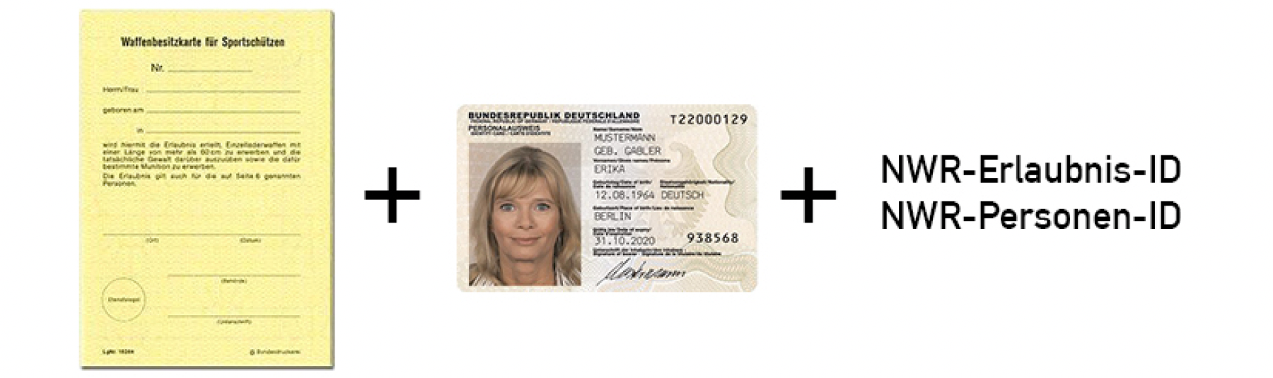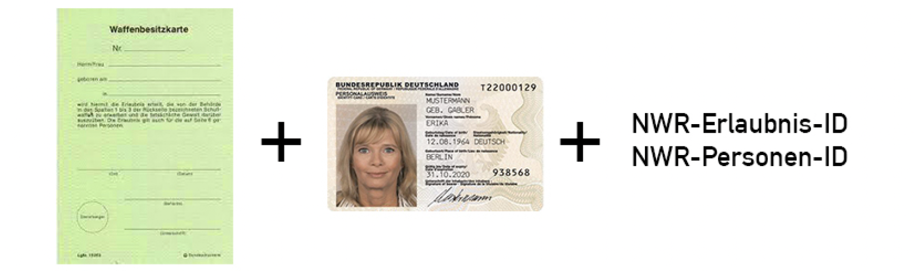 Waffenbesitzkarte im Original oder Kopie. Zusätzlich benötigen wir eine Kopie Ihres gültigen Personalausweises. Sowie die NWR Personen- und Erlaubnis-ID Nummern.