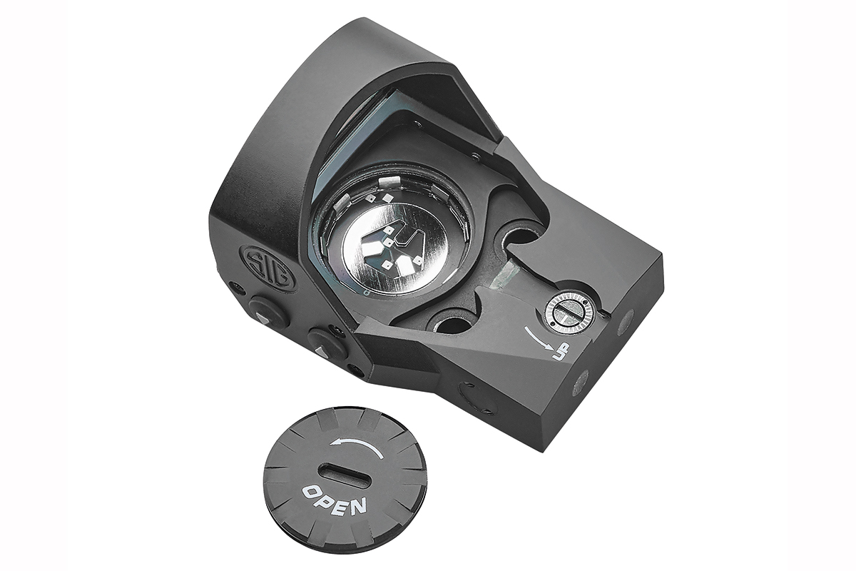 - Die CR1632-Batterie wird von oben eingelegt, ohne das Visier von der Handfeuerwaffe abzumontieren